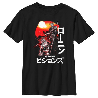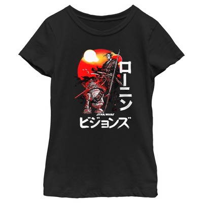 Stylized anime samurai versions of Darth Vader, Boba Fett, R2-D2, and C-3PO are looking fierce across the front of this Girls' Tee from Star Wars: Visions.