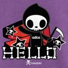 • Strut your stuff with this stylish new girls' t-shirt that is perfect for the scariest time of the year! Featuring the mischievous Adios in his coffin, the word "Hello" printed in bone-shaped letters, and the classic Tokidoki logo printed below.