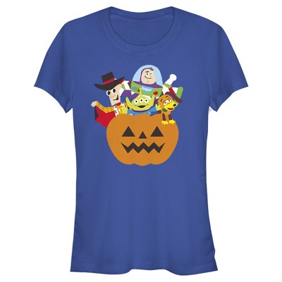 What's better than candy? The Toy Story Halloween Toy Treats Girls' Tee of course! This fun Halloween tee features Woody, Buzz, Slinky, and an Alien, all inside a jack-o'-lantern.