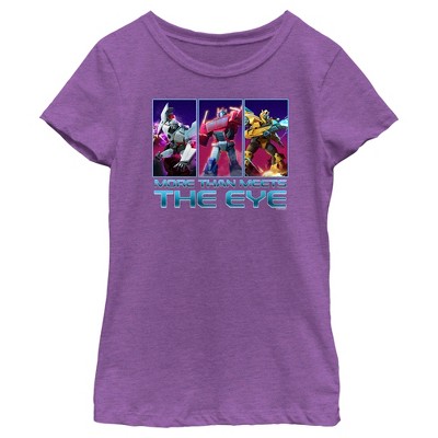 • Strut your stuff with this stylish new girls' tee that is perfect for every occasion, featuring three panels with Megatron, Optimus Prime, and Bumblebee inside and the classic quote: "More Than Meets The Eye," below them!
