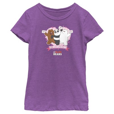 Join your favorite brother bears as they navigate the San Francisco Bay Area and try to find fame on the internet in the hilariously quirky Cartoon Network cartoon We Bare Bears with officially licensed apparel for the whole family! This Girls' We Bare Bears Valentine's Day Ice Bear Gives Hearts Graphic T-Shirt features Ice Bear holding pink heart balloons along with the phrase: "Ice Bear Gives Hearts" in white, pink, and purple bubble letters.