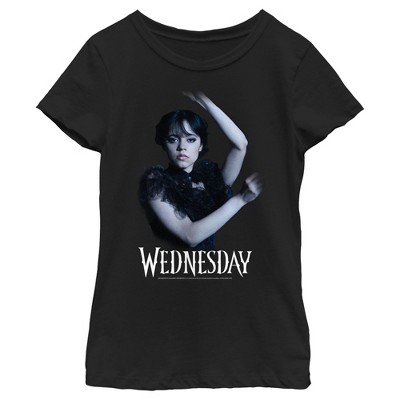 Join Wednesday Addams, the death-obsessed daughter from the iconic Addams Family franchise as she attends Nevermore Academy, hones her psychic abilities, and solves age-old mysteries in the spine-chilling new series Wednesday from Netflix! This officially licensed Wednesday Darkness My Old Friend Girls' Graphic T-Shirt features a black-and-white illustration of Wednesday framed by flowers and the phrase: "Darkness My Old Friend" across the front. Get some new Wednesday designs and embrace the darkness!