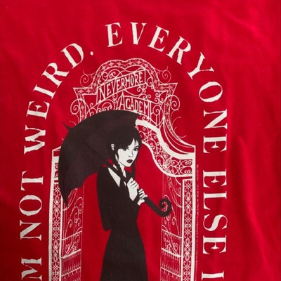 Join Wednesday Addams, the death-obsessed daughter from the iconic Addams Family franchise as she attends Nevermore Academy, hones her psychic abilities, and solves age-old mysteries in the spine-chilling new series Wednesday from Netflix! This officially licensed Wednesday I'm Not Weird, Everyone Else Is Girls' Graphic T-Shirt features an illustration of Wednesday under an umbrella, the iconic Nevermore Academy gates, and the classic TV series logo in white print across the front. Get some new Wednesday designs and embrace the darkness!