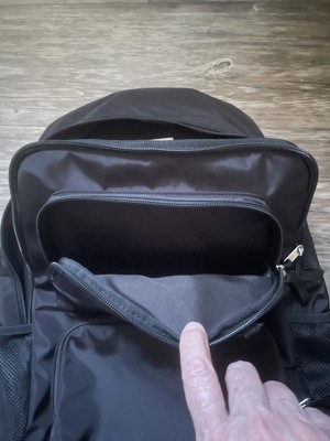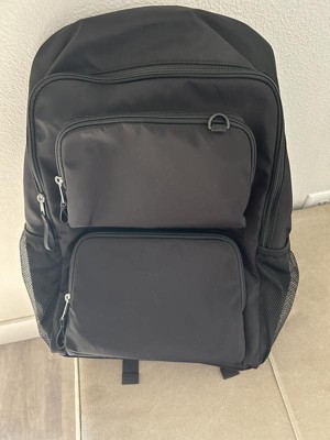 This 18” black backpack has two zipper pockets in the front. Nice size for keeping all your essentials concealed. The interior has a divider to keep things safe and organized. The padded straps are adjustable which makes this backpack easier and more comfortable to carry. There is a mesh pocket on each side for drinks, etc. This is a very nice durable backpack for school or any other activities that you might need it for.