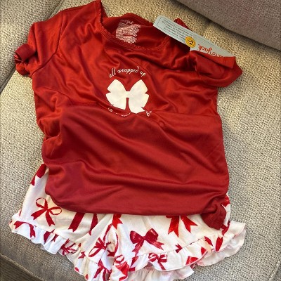 They'll be ready to enjoy winter nights in bright and cozy style wearing the 2-Piece Bows Short-Sleeve Holiday Pajama Set from Cat & Jack™. This two-piece pajama set includes a short-sleeve pajama T-shirt and a pair of ruffled pajama shorts, both designed in red and featuring bow prints for a sweet and festive look. Made of 100% recycled polyester jersey fabric, this pajama set offers them all-night cozy comfort.
