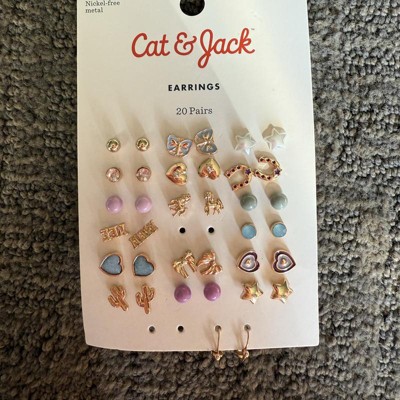 Add a touch of whimsy to any outfit with this Girls' 20pk Western Earring Set - Cat & Jack™. Featuring a delightful mix of drop and stud styles, these earrings are crafted from nickel-free metal, zinc alloy and recycled zinc, ensuring both style and comfort. The vibrant multi-colored designs make them a fun accessory for kids and teens alike. With a secure post closure, these earrings are perfect for everyday wear or special occasions.