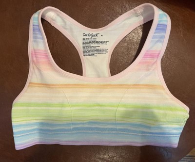 The Girls' 2pk seamless Sports Bras by Cat & Jack came with one solid white, one with one striped pastel colors. The bras are really comfortable and wash up very well, My daughter wears them all the time whether it’s under clothes or just to sleep in them