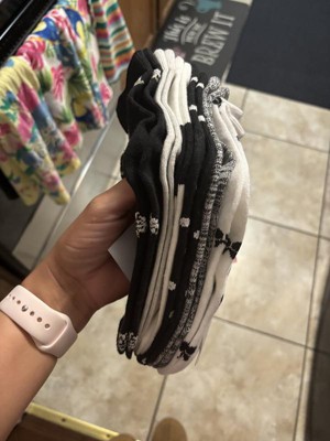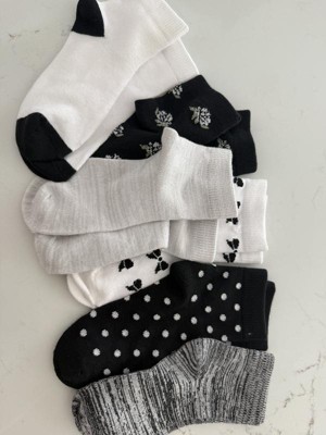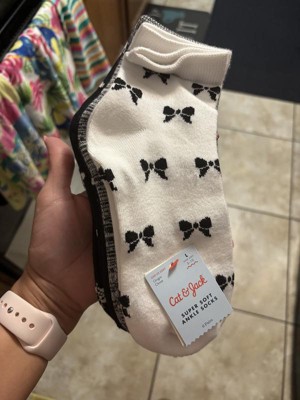 A: The socks feature cute all-over bow designs in a mix of black and white.