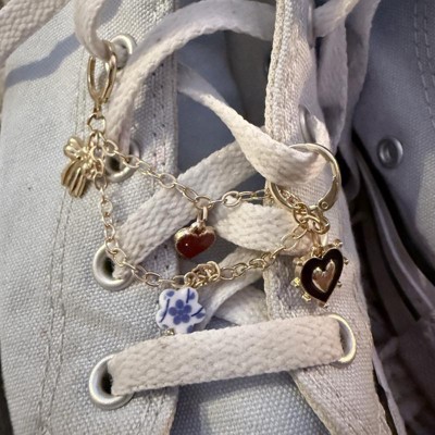 [This review was collected as part of a promotion.] These shoe charms are perfect to jazz up my daughter's white sneakers. She loves fun jewelry and bling. These are a great, girly set. You get five individual charms, a bling heart, a golden rose, a gold heart with a clear stone in the middle, a black ribbon bow and a golden shamrock. Then you also get a chain charm that has four charms strung together all in one with a golden bow, a red heart, a blue and white flower and a black and gold heart. The clasps are easy to open and close so you can change up your design daily. They are all adorable and my daughter just loves them! I received an incentive to write this review.