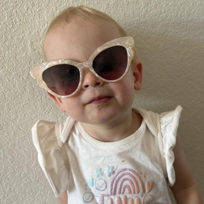 [This review was collected as part of a promotion.] These are so fun!! My almost 2 year old daughter loves them! They’re a little large on her, but they stay on pretty well and she has plenty of room to grow into these. The design is just adorable! Love the butterfly wing shape - looks like a vintage cat eye vibe from afar. The color and finish is really unique too - kind of a pearlescent look to it. The color still looks pretty on my fair completed daughter. Definitely recommend these! I received an incentive to write this review.
