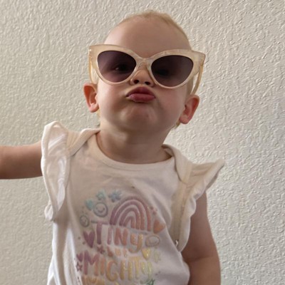 Add a touch of magic to your little one's look with the Girls' Butterfly Wing Sunglasses - Cat & Jack™ Gold. These fun sunglasses feature butterfly wing-shaped frames in vibrant gold, perfect for sunny days. The UV-protection lenses keep your kids’ eyes safe while they enjoy outdoor adventures. Fun and stylish, these sunglasses are a great accessory for any outfit.