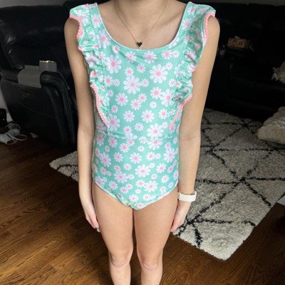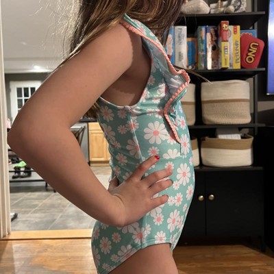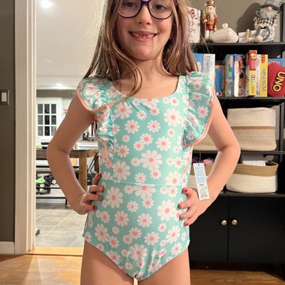 Add a refreshing cute style to your kid's swim closet with the Endless Daisies Floral Printed One-Piece Swimsuit from Cat & Jack™. This sleeveless swimsuit is covered with daisy print and adorned with ruffles that run from shoulders to waist for a beautiful look. The UPF 50+ rated design helps keep them shielded from harmful UV rays, while the pull-on style allows easy wear and removal. Providing full coverage, this printed swimsuit is tailored from a recycled polyester-spandex blend with full lining for flexibility and comfort all through their waterside activities.