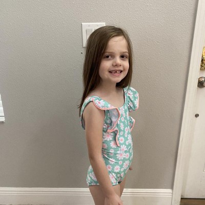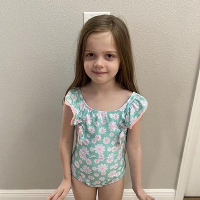 [This review was collected as part of a promotion.] This size Small 6 or 7 Endless Daisies Flower Printed One Piece Swim Suit fits my 7 year old perfectly. I love the daisies on the light aqua background. It also has the two shoulder ruffles and a scoop back for added style to a one piece suit. My daughter feels fancy in this suit. It is perfect for the beach and pool or resort with a white sun hat and cover up. The price is standard. I love this suit! I received an incentive to write this review.