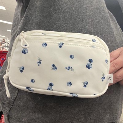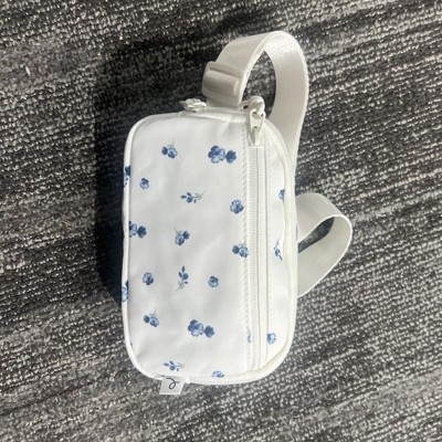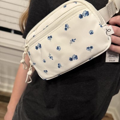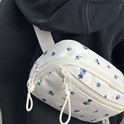[This review was collected as part of a promotion.] This is a great size adjustable waist or crossbody purse. There is a buckle closure along with an adjustable strap to fit many sizes. The delicate blue flower pattern is perfect and the purse is white in color as the base. There are zippered pockets along with mesh dividers inside. It is lightweight and easy to wipe clean. Quality made for the price point! Highly recommend. I received an incentive to write this review.