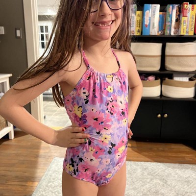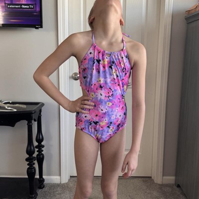 Brighten up your kid's swim looks with the Floral Printed One-Piece Swimsuit from art class™. Covered with floral print, this sleeveless swimsuit has a halter neckline to elevate the look. This full-coverage swimsuit is made from a recycled polyester-spandex blend with full lining for stretchy comfort for all their beachside or water activities. Plus, it has a UPF 50+ rated design to help keep their skin shielded from harmful sun rays.