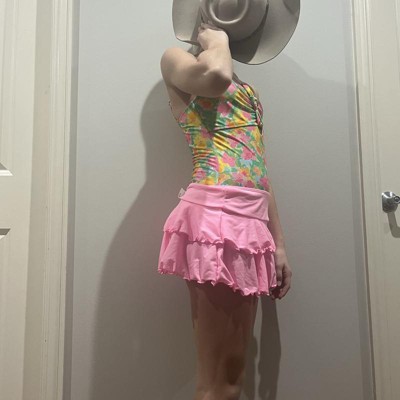 [This review was collected as part of a promotion.] This is an XL (14) and runs true to size. The colors are very bright and vibrant. The skirt is sheer and matches the rest of the suit. It’s very cute and catches your eye. However, the material seems thinner and doesn’t have a second layer in there. The top needs padding or an extra layer so you can’t see through it. I was disappointed in this suit for that reason. If you aren’t worried about that, it is a cute suit. I received an incentive to write this review.