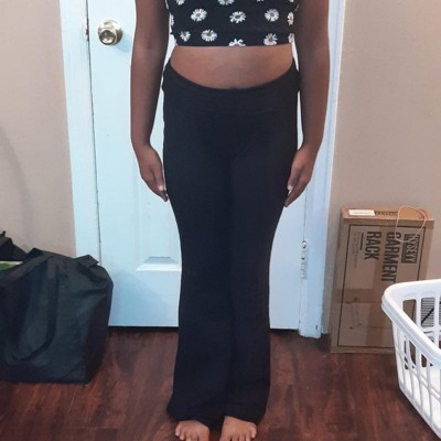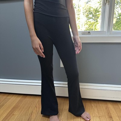 [This review was collected as part of a promotion.] I purchased these leggings for my 11 year-old daughter because I wanted to get her some basics that were still a little stylish. The flared leg are a little different than what she normally wears and they look really cute with sneakers and flip-flops. The material has a nice stretch to them and she said they are comfortable. She is around 89 pounds so I ordered her a size large and the fit was just right. They also hit right at her ankle so they were a great length as well. I received an incentive to write this review.