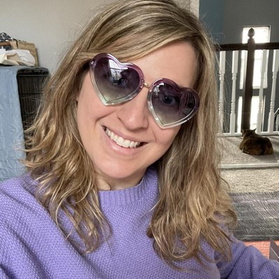 A: The sunglasses have a playful heart shape, adding a trendy touch.