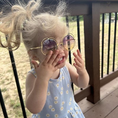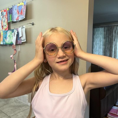 [This review was collected as part of a promotion.] These purple and gold metal flower sunglasses fit my nine year old perfectly. They were an instant fit when she tried them on and will be a summer staple. These definitely have a hippie vibe and she was a fan. The sunglasses stayed in place well and did not slip down her nose or ears as she moved around. The lens is purple at the top and then fades to a yellow color which gives a groovy vibe. I received an incentive to write this review.