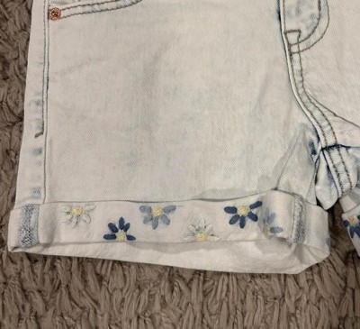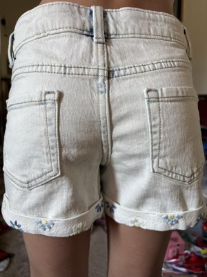 Refresh their warm-weather clothing with these Mid-Rise Embroidered Cuffed Denim Shorts from Cat & Jack™. Made from denim fabric with added stretch for comfortable wear, the mid-rise shorts feature distressed detailing with embroidered cuffs for a cool look. The adjustable waistband with a fly snap and zipper closure lends a snug fit, while the front and back pockets provide space for small essentials. They can pair them with a range of shirts and sweaters along with sneakers for versatile outfit options.
