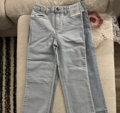 Refresh your child's everyday wardrobe with these Mid-Rise Denim Straight Jeans from Cat & Jack™. Made from a midweight cotton-recycled polyester blend with spandex and comfy lining, these mid-rise jeans are designed with a straight-leg silhouette. The adjustable waistband with a front snap and zip fly along with belt loops offers a secure fit, and the classic five-pocket style completes the look with functional flair.