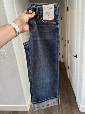 Add floral charm to their denim collection with these Mid-Rise Floral Embroidered Cuff Wide-Leg Jeans from Cat & Jack™. The mid-rise jeans tailored in a wide-leg fit feature embroidered floral detailing on the cuffs for a sweet look. Made of cotton-spandex blend denim fabric, these jeans have a fly button closure for a snug, stay-put fit. Plus, two front and back pockets provide space for stashing their on-the-go essentials.