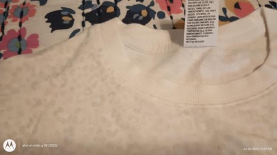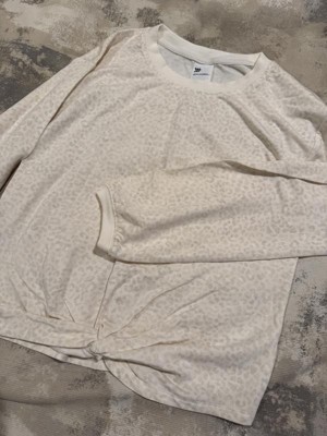 This girls' crewneck sweatshirt is extremely soft and lightweight. It is true to size, has longer length sleeves, and a little knot design in the front bottom making it a little shorter in the front. It's a cream color with a subtle light tan cheetah/leopard print. Both the crewneck and sleeves have a matching solid tan ribbed cuff. This sweatshirt is so cute and she is excited to wear it all the time in the fall and at school! Very fashionable!