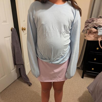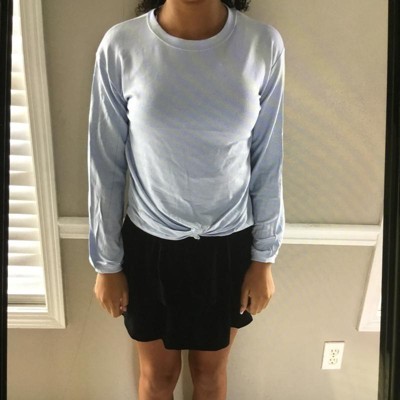 [This review was collected as part of a promotion.] The sweatshirt was a cute find for my 11-year-old daughter. We went with a size large and it fit her well; for reference she is around 85 pounds. The light blue color is really pretty in person – soft and fresh without being too bright. It’s made of a lightweight material so it is definitely more of a spring/summer or layering piece rather than something super cozy. The fabric was a little on the thin side so she will be likely be pairing this with a tank underneath. It has a nice front knot detail which makes it feel a little more styled than a basic sweatshirt. I received an incentive to write this review.