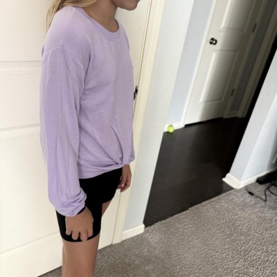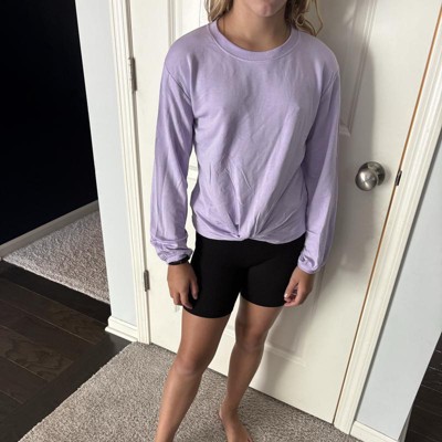 [This review was collected as part of a promotion.] This lavender shirt is a perfect chill back to school piece. It is very soft and cozy. She is wearing a size large and it fits true to size. The arm length is great and still gives her a bit of room to grow. The knot in the front is a perfect detail to give it a little something. My daughter loves this top and plans to wear it to school and to sports. There are tons of cute color options too! I received an incentive to write this review.