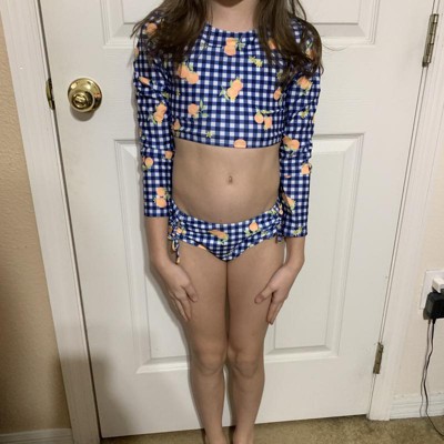 Your kid will make a splash in fun and comfort with this Fruit Printed And Gingham Checkered Rash Guard Set from art class™. This two-piece swimwear set features a long-sleeve rash guard and a pull-on bikini bottom, both adorned with navy gingham check and accented with playful fruit and floral motifs. Crafted from recycled polyester with spandex, the set offers a UPF 50+ rating for enhanced UV protection. The rash guard boasts a cutout with a tie-back closure, while the bikini bottom showcases side cutouts with charming tie accents.