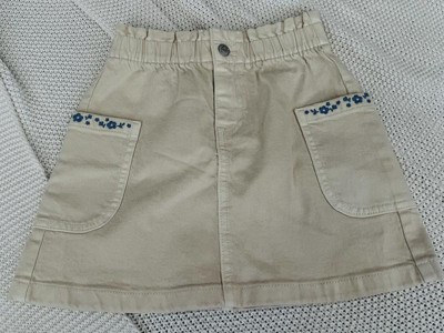 This Cat & Jack skirt is very pretty. Its embroidered cargo pockets on the sides give it a special touch. It's very comfortable and stretchy. The skirt has a snap button and a zipper closure. It runs true to size; she wears a size M (8) and it fits perfectly. It's perfect for school. Excellent quality.