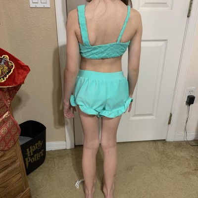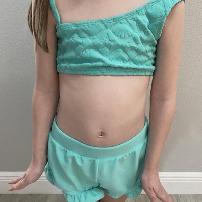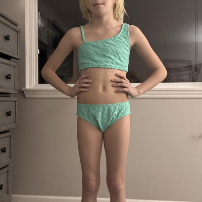 [This review was collected as part of a promotion.] This Size Small 6 or 7 Girls Park to Pool Solid Bikini Set fits my 7 year old perfectly. The design is so cute in aqua with seashells textured on swimsuit. It also has a stylish asymmetrical strap. The ruffled shorts make this a great set that already has versatility for a resort wear. It is perfect for the beach and pool also. The price is standard for this type of swimsuit. I received an incentive to write this review.