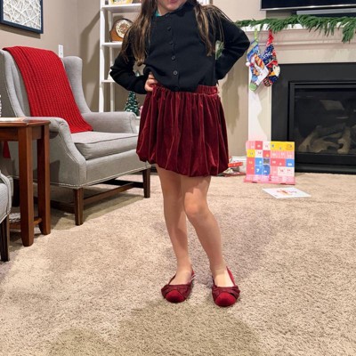 [This review was collected as part of a promotion.] These velvet ballet flats are a beautiful deep red color and have a cute bow detail. They are slip on and my daughter says they feel comfortable and fit well. She usually wears a size 1 so that is the size I ordered for her and they fit true to size. They are festive and cute while also practical and comfortable. She is excited to wear them to holiday parties this season!