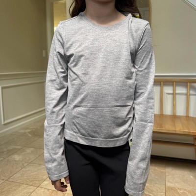 [This review was collected as part of a promotion.] This long sleeve tee was picked out for my 11 year-old daughter who is around 89 pounds and the size large fit her really well. She really liked the gray color – it’s cute and she will be wearing it mostly to dance over her leotard. The fabric is soft and lightweight, which makes it perfect for dancing. The fit is comfy without being baggy, and the seamless design is great. I received an incentive to write this review.