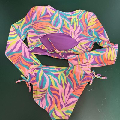[This review was collected as part of a promotion.] We purchased this swimsuit in a size large for our 11-year-old daughter, she is around 90 pounds for reference. The fit was just right and we especially liked the longer sleeves so we don’t have to constantly reapply sunscreen on her arms when she’s out in the sun. The opening in the back is cute without taking away from the coverage. She loved the bottoms with the ruched sides and the little bead details. The colors on the swimsuit are vibrant and the pattern is funky. Overall it is a really cute bathing suit set. I received an incentive to write this review.
