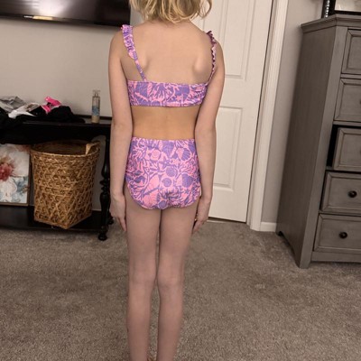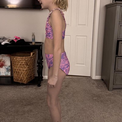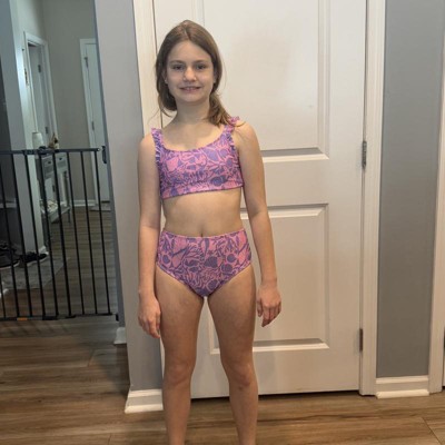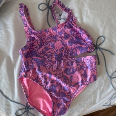 Add ocean-inspired flair to your child’s swim wardrobe with this Seashell Printed Bikini Set from Cat & Jack™. Designed with a purple seashell print on a lavender-pink backdrop, this two-piece swimwear is crafted from recycled polyester with metallic fibers and spandex for comfort and a hint of shine. The bralette-style top features ruffle-accented straps, while the high-waist, pull-on swim bottom adds a stylish touch. Both pieces offer UPF 50+ protection, blending function and fashion for sunny-day adventures.
