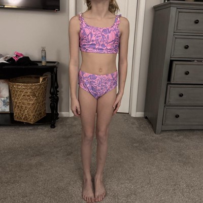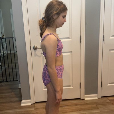 [This review was collected as part of a promotion.] This is a size XL (14) and runs true to size. I loved this suit. The colors are pretty but it also has a sparkle to it. The bottoms are full coverage which I appreciated. The top is more of a sports bra type so they can jump around and be very active in this suit. This also has an extra layer in the top and bottoms so it seems pretty sturdy. This is cuter in person and my daughter loved it. I received an incentive to write this review.