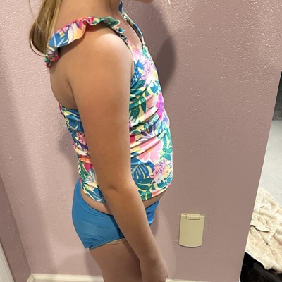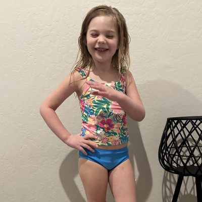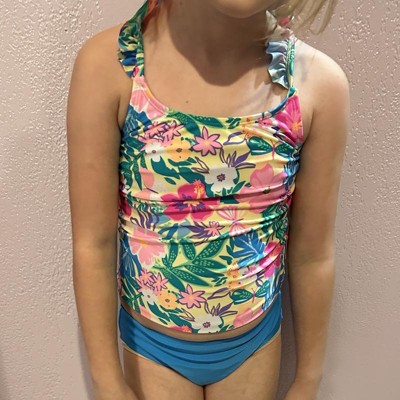 Add seaside fun to your kid's swim closet with the Seaside Hibiscus Floral Printed Tankini Set from Cat & Jack™. This two-piece tankini set includes a floral print top with ruffles along the shoulders and a solid-color swim bottom for a coordinated look. Providing classic coverage, this swimwear set is tailored from recycled polyester-spandex blend fabric with full lining for flexibility and comfort all through their waterside activities. Plus, the pieces have a UPF 50+ rated design to help keep their skin shielded from harmful sun rays.
