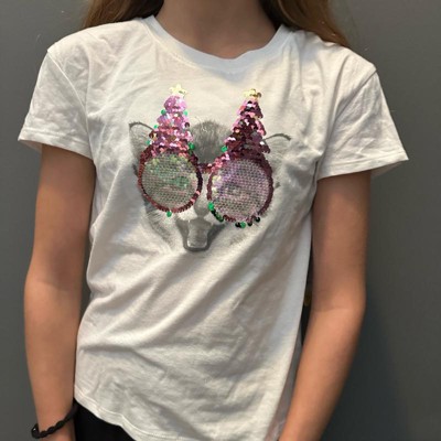 [This review was collected as part of a promotion.] I purchased this online for my 12 year old daughter in size XL which is a 14. My daughters normal size is between 12-14 as she likes her shirts oversized. This fit smaller than I thought it would for a 14 but it did for her. She likes the the reversible pink and green. The shirt is so cute for the holidays and she loves flipping them back and forth to change the colors on the Christmas-tree sunglasses. The little cat face underneath is subtle but adds the cutest touch. The shirt is soft and comfortable but also a little thin.