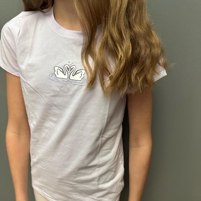 [This review was collected as part of a promotion.] I ordered this T-shirt for my almost 10-year-old daughter in a size medium, which is equivalent to an eight. She is average height, but is a very slender build and typically wears a medium in her shirts. The shirt fit her really well. The sleeves are a nice length and there’s plenty of room in the torso. The little swan graphic is maybe a bit better suited to younger girls, because my daughter wasn’t the biggest fan. I will say the quality of the shirt is great for the pricing.