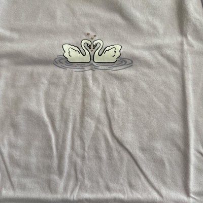 [This review was collected as part of a promotion.] My 11-year-old daughter (About 90 pounds) got this in a size large. she is petite but mostly does wear a size large and shirts and this one fit her well, it was true to size. It was lightweight and had a soft material, but with that being said, she didn’t love the Swan graphic once she saw it in person – it wasn’t really her style. Still, of the quality and feel are nice and it’s cute but she wasn’t obsessed with the graphic.