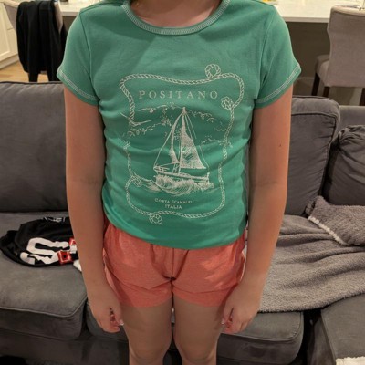 [This review was collected as part of a promotion.] I purchased this tee shirt to add to my daughter's summer play shirt collection. I purchased size 10-12 for my 11 year old daughter who is normally a size 12. I probably could have gone up another size but this still fits her true to size. The Positano graphic gives it a fun, summery vibe, and the green color is vibrant without being too bright. It's nice to have a different green in her shirt collection. The material is soft and lightweight. I received an incentive to write this review.