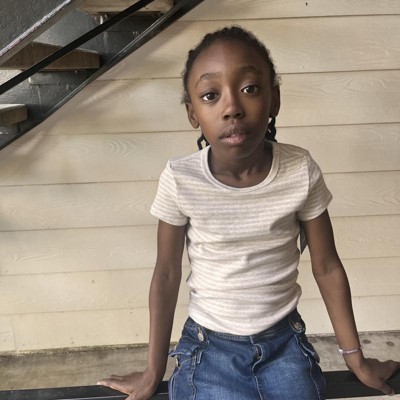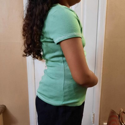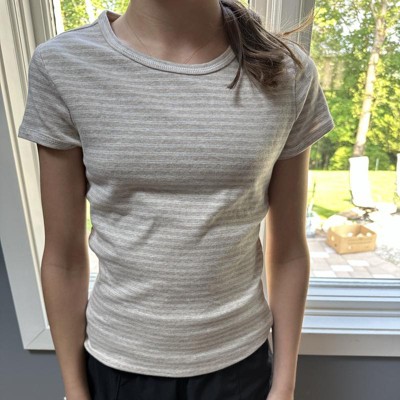 [This review was collected as part of a promotion.] I purchased this short sleeve T-shirt for my 11-year-old daughter in a size large. She is about 85 pounds and it fit her really well. I liked the oatmeal/cream color because it is neutral and it matches pretty much anything. The material is very soft and stretchy and it looked nice on her. It was a great length, it was not too short/long on her, many shirts that are being sold today are cropped, so this one was perfect. I received an incentive to write this review.