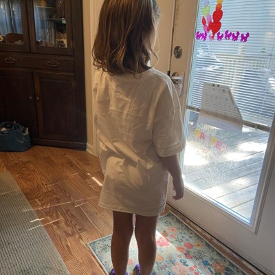Cute shirts! Love this style of the oversized fit! Too many shirts have become too boxy or short for young girls and I’m pleased Target is designing this style. I would stick with your normal size because they shrink a little bit in the dryer. But we have also been able to size down and get away with it. They wash well and my girls love them! Love these shirts most with some biker shorts or leggings. Very cute!