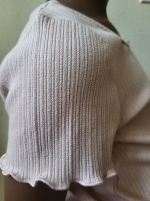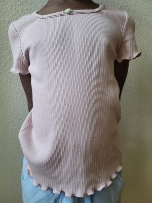 Girls Short Sleeve Ribbed T-Shirt by Cat & Jack is a great staple to wear. Its a pretty mauve/pink color with ruffle detail. I love that its a regular size and length shirt. The material is soft, it keeps its shape, size and color after washing.