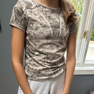 [This review was collected as part of a promotion.] I bought this T-shirt for my 11-year-old daughter who is around 89 pounds and the size large fit her perfectly. The cut looks cute on her, it wasn’t boxy at all. She is not a fan of jeans so she is wearing it mostly with leggings. She really liked how off the material felt and I was impressed that it has a great amount of stretch. The tan color is cool with the camo print and overall, it’s a great everyday shirt that is durable. I received an incentive to write this review.