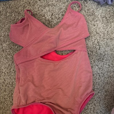 My daughter loves this suit. The adjustable straps are a useful feature. I wish more swimsuits had them. The material is leotard like and durable. There is a bit of gold sparkle on the pink. It runs true to size. Best suit I've purchased from Target!