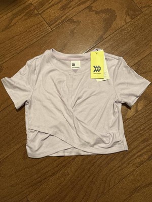 Girls lilac colored t-shirt is really soft and stretchy. It’s a cropped length made of ribbed modal and spandex blend which gives it that soft and stretchy feel. Great for athletic wear or play. Overlapping front is edgy!