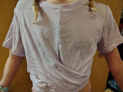 Love this cute top for girls! The lavender color is pretty. Yea, the top is short, but for a little girl it would be super cute over a tank top or dress if you didn’t want to have her show her stomach. The material is soft, rimmed and not too too thin. The twist part adds another style pop and isn’t too big. It would be perfect for with jeans, leggings or a dress to add a little color pop. I would definitely recommend this top!