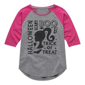 Barbie - Halloween Collage - Toddler And Youth Girls Raglan Graphic T-Shirt - Step into the glamorous pink world of Barbie with our officially licensed graphic garments for the fashion-forward! Whether you dream of being a fashion designer, a mermaid princess, or a world-traveling explorer, our garments bring Barbie's world to life with vibrant colors and playful prints. Crafted with quality materials and attention to detail, each piece ensures comfort and durability for all-day play. Express your unique sense of style and imagination with our exclusive Barbie graphic apparel!